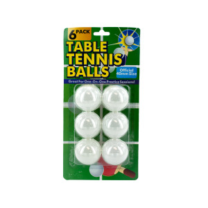 Excellent for practice or family fun time, this 6-piece Table Tennis Balls Set features official size strong plastic balls with maximum bounce and spin. Each ball measures approximately 1 3/4" in diameter. Comes packaged in a blister pack.