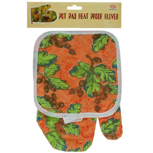 | Perfect for moving hot dishes and trays in and out of the oven, this Quilted Floral & Fruit Print Oven Mitt & Pot Holder Set features a durable, padded mitt to protect hands from heat and a matching pot holder. Both pieces have white trim and hanging loops for easy storage. Mitt measures approximately 9.25" x 6.5" and pot holder measures approximately 6.75" x 6.75". Comes in assorted styles. Comes packaged in a poly bag with a header card. |